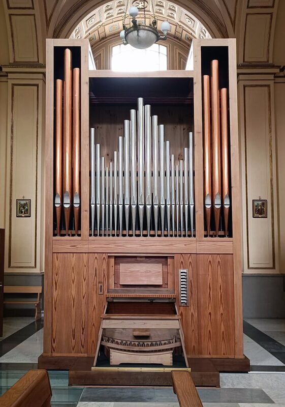 Claudio Anselmi Tamburini bouwde in 1992 een nieuw koororgel met mechanische tractuur, sleepladen, 11 stemmen, 1 manuaal en een vrij pedaal voor de Cattedrale di San Pancrazio in Albano Laziale (Roma) Italië. Het pedaalklavier is radiaal concaaf.