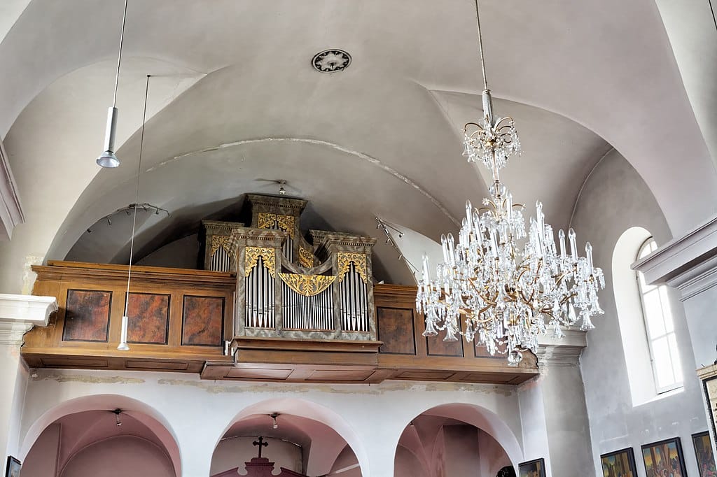 HAUPTWERK (C-f3): 54 TOETSEN Waldflöte 8′, Prinzipal 8′, Octav 4′, Dulciana 4′, Quint 2 2/3′, Superoctav 2′, Mixtur 3 fach.