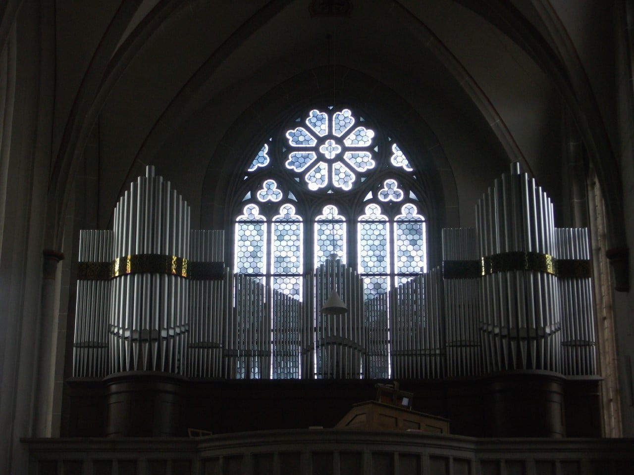 Koppelingen: I. Manual – II. Manual, I. Manual – III. Manual, II. Manual – III. Manual, Pedal – I. Manual, Pedal – II. Manual, Pedal – III. Manual, Suboctavkoppel I. Manual – III. Manual, Superoctavkoppel I. Manual – II. Manual, Superoctavkoppel II. Manual.
