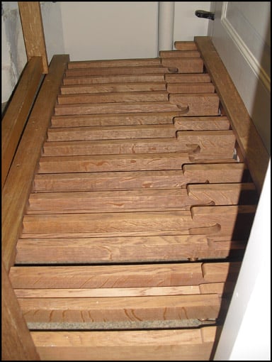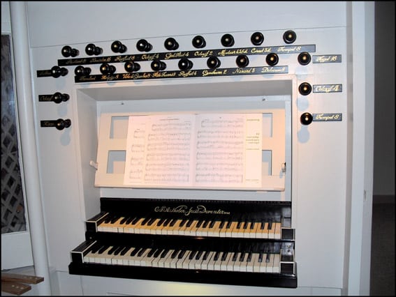 ONDERPOSITIEF (C – f3) 54 TOETSEN: Holpijp 8′, Viola di Gamba 8′ – 1842/ca. 1900, Flûte Travers 8′ (from c°) – 1973, Roerfluit 4′, Nasard 2 2/3′ (from c°) – 1948, Gemshoorn 2′, Dulciaan 8′ – 1973.