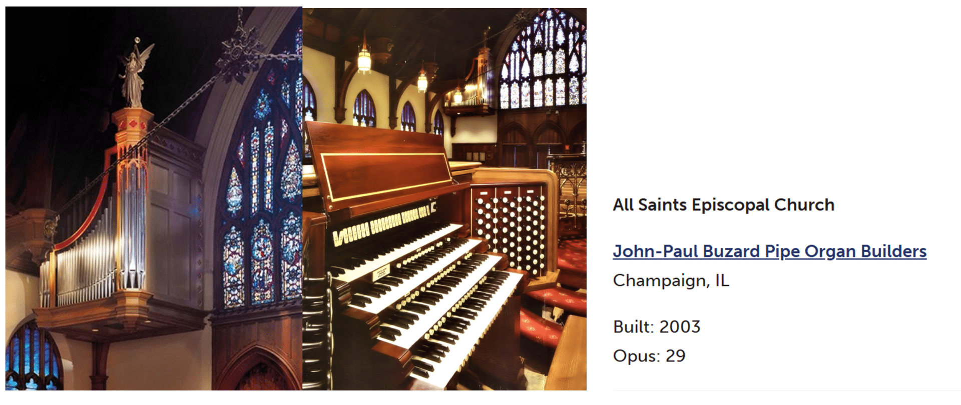 John-Paul Buzard Pipe Organ Builders bouwde in 2003 opus 29. Een nieuw sleepladen-orgel met elektrische tractuur, 65 stemmen, 4 manualen en een vrij pedaal voor de All Saints Episcopal Church in Atlanta (Georgia) USA. Het wordt het James G. Kenan Memorial Organ genoemd. Het pedaalklavier is radiaal concaaf.