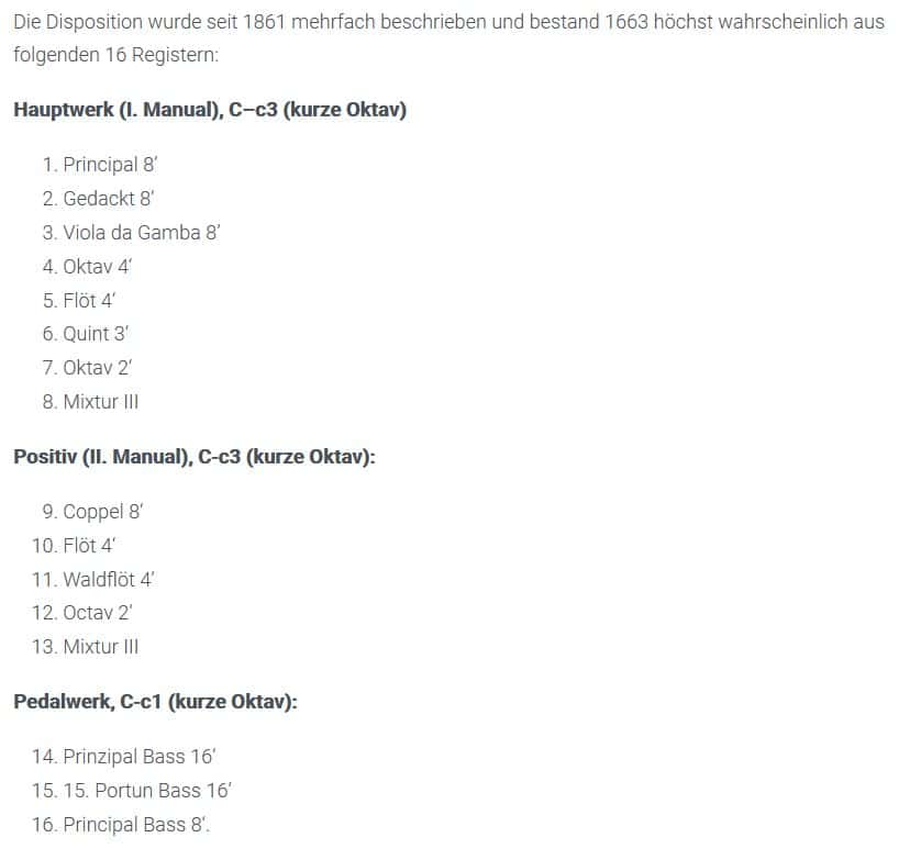 PEDAL (C – f1) 30 TOETSEN: Subbaß 16′, Octav 8′, Bassetto 4′, Choralbaß 2′, Mixturbaß 4 fach (1 1/3′).