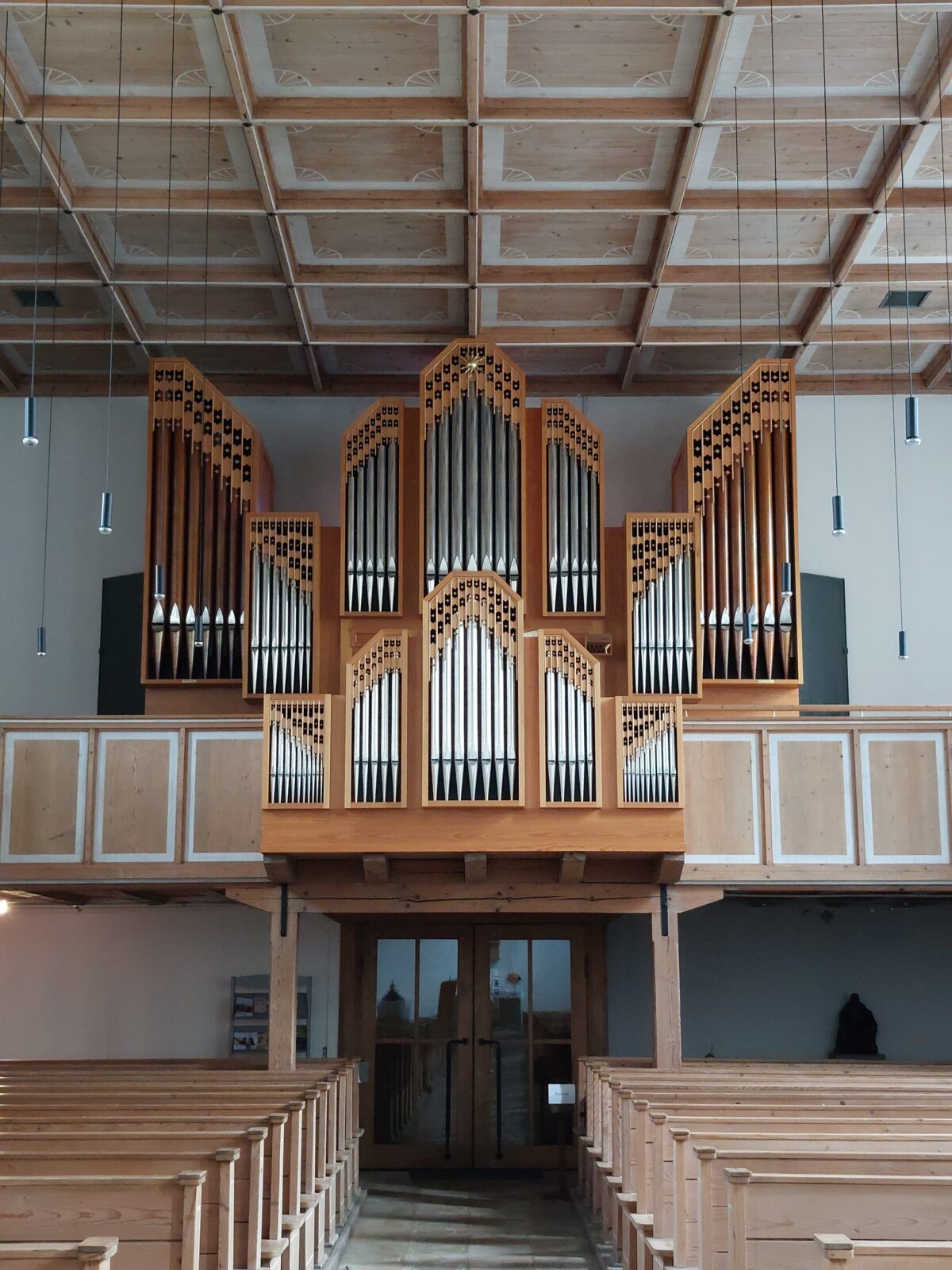 RÜCKPOSITIV (C-g3): 56 TOETSEN Gedackt 8′, Praestant 4′, Rohrflöte 4′, Nasard 2 2/3′, Blockflöte 2′, Sifflöte 1 1/3′, Terzflöte 1 3/5′, Oktave 1′, Cymbel 3 fach (1/2′), Dulcian 16′, Krummhorn 8′, Tremulant.