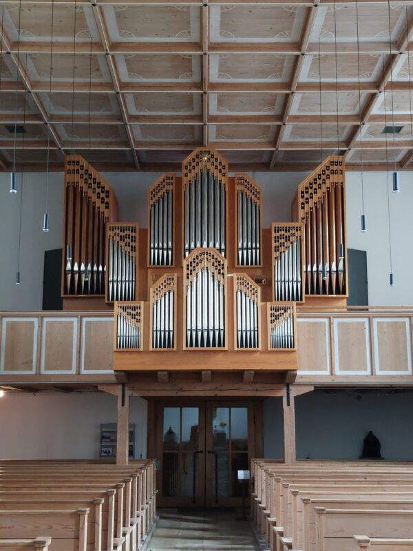 HAUPTWERK (C-g3): 56 TOETSEN Quintade 16′, Prinzipal 8′, Gemsrohrflöte 8′, Oktave 4′, Gambetta 4′, Quinte 2 2/3′, Superoktave 2′, Terz 1 3/5′, Mixtur 4-5 fach (1 1/3′), Trompete 8′, Tremulant.