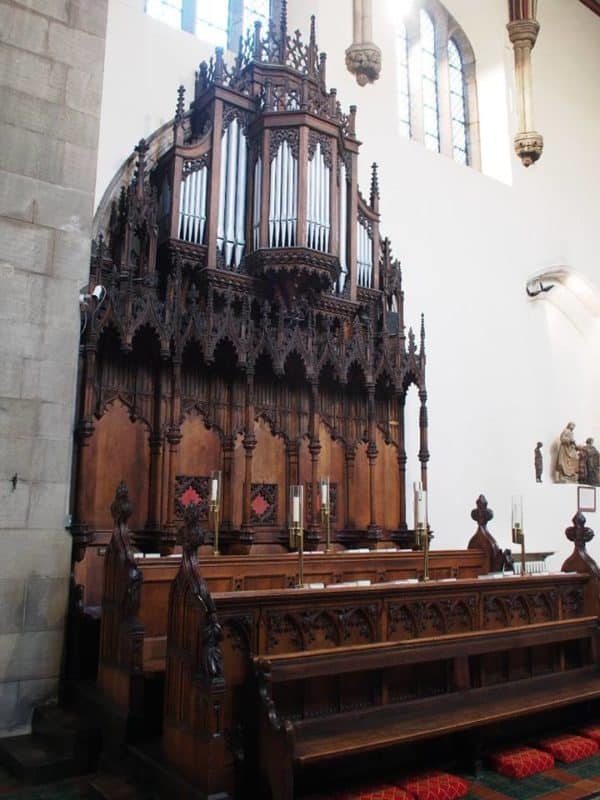 Choir Organ (enclosed): C – a3 Contra Dulciana 16′, Lieblich Bourdon 16′, Geigen 8′, Stopped Diapason 8′, Viola 8′, Dulciana 8′ – extension, Vox Angelica 8′, Unda Maris 8′ (2 ranks), Gemshorn 4′, Dulcet 4′ – extension, Suabe Flute 4′, Rohr Flöte 4′, Nazard 2 2/3′, Dulcet Twelfth 2 2/3′ – extension, Harmonic Piccolo 2′, Dulcet Fifteenth 2′ – extension, Tierce 1 3/5′, Dulcet Mixture 3 ranks – extension, Contra Clarinet 16′, Clarinet 8′ – extension, Tremulant.