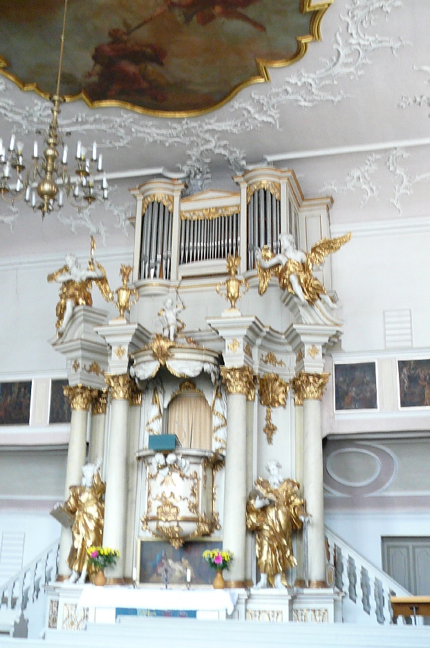 De Spitalkirche in Bayreuth werd in 1746 voltooid. In de jaren 1749-1750 bouwde Christian Gottlob Hubert een nieuw orgel met vijf stemmen voor de kerk. Het werd geplaatst in een fraaie rococo-kas van de hand van Johann Gabriel Räntz. In 1846 bouwde Ludwig Weineck een nieuw orgel voor de Spitalkirche. Het oude instrument is daarna overgeplaatst naar de Gottesackerkirche. Het huidige orgel is in 1956 gebouwd in de kas van Weineck door de firma Rieger Orgelbau. Het instrument met 2 manualen, pedaal en 18 stemmen werd op 2 juli 1956 in gebruik genomen.1956