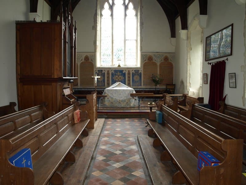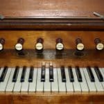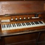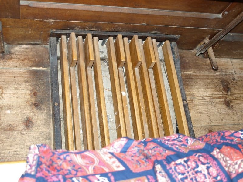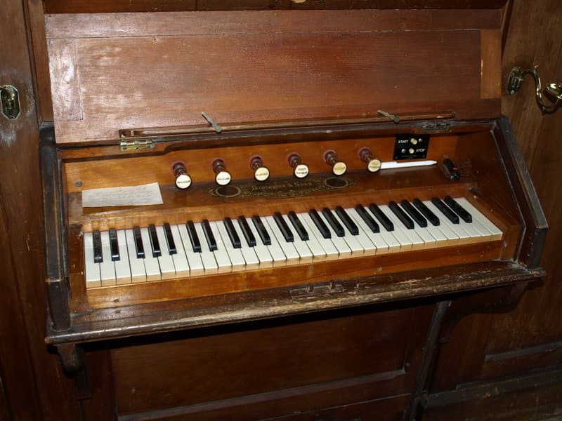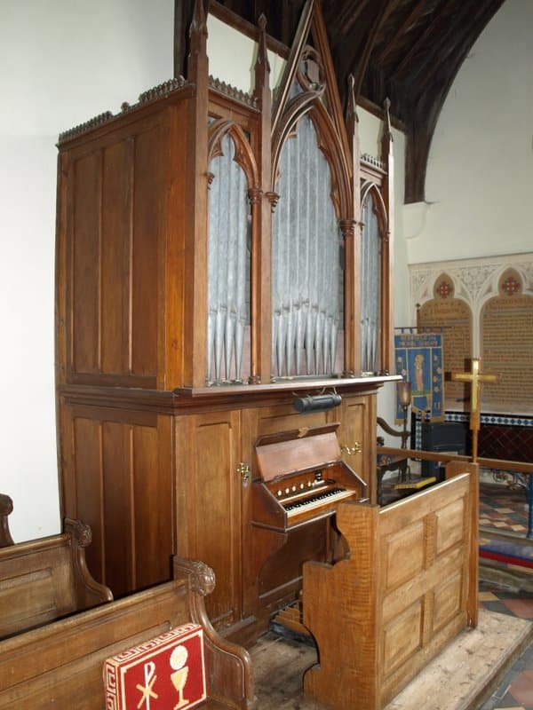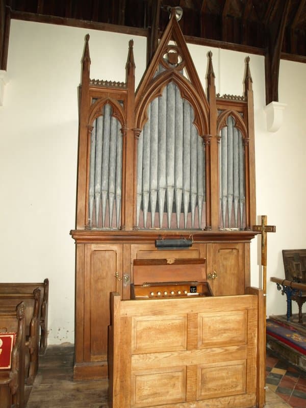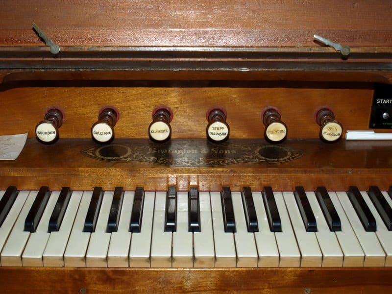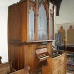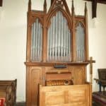 Manual: C – f3 Bourdon 16′ (C-H), Open Diapason 8′ – unenclosed, Stopped Diapason 8′, Clarabella 8′, Dulciana 8′ (TC), Principal 4′.