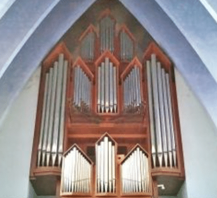 HAUPTWERK (C – a3) 58 TOETSEN: Pommer 16′, Prinzipal 8′, Holzflöte 8′, Spitzgambe 8′, Quinte 5 1/3′, Oktave 4′, Gedackt 4′, Quinte 2 2/3′, Oktave 2′, Oktave 1′, Kornett 5 fach, Mixtur 5 fach, Scharff 4-5 fach, Spanische Trompete 16′, Spanische Trompete 8′, Tremulant.