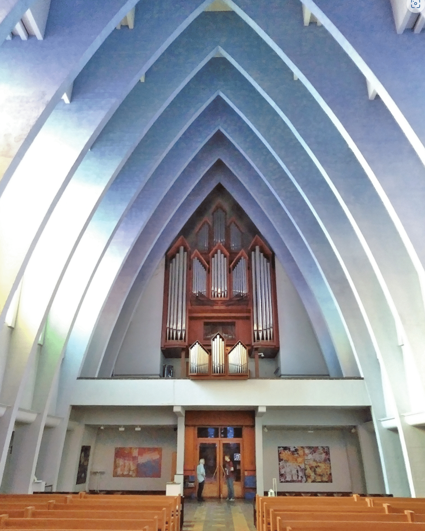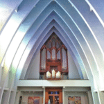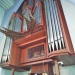 RÜCKPOSITIV (1975) (C – a3) 58 TOETSEN: Gedackt 8′, Quintade 8′, Rohrflöte 4′, Nasat 2 2/3′, Prinzipal 2′, Terz 1 3/5′, Quinte 1 1/3′, Scharff 5 fach, Zimbel 2 fach, Rankett 16′, Krummhorn 8′, Clairon 4′, Tremulant.