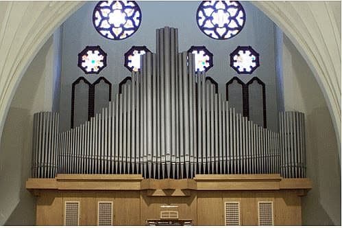 I. Manual: Principal 16′, Principal 8′, Gamba 8′, Dolce 8′, Gemshorn 8′, Gedeckt 8′, Harmonieflöte 8′, Octav 4′, Rohrflöte 4′, Cornett 2-3 fach (2 2/3′), Mixtur 3-4 fach (2′), Tuba 16′, Trompete 8′.