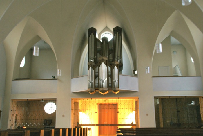 Bisher habe ich leider noch keine näheren Informationen zu dieser Orgel gefunden. Sobald ich Neues weiß, liefere ich sie nach; ich recherchiere bei Fa. Sauer & Heinemann. Vermutlich stammt das Gehäuse nicht von 1850, sondern von Sauer (1992). Das könnte dafür sprechen, dass er unter Verwendung alten Materials 1992 einen technischen Neubau erstellt hat. Wir werden sehen …Es handelte sich in der Tat 1992 um einen technischen Neubau unter Verwendung größerer Teile des seinerzeit vorgefundenen Pfeifenmaterials, das in ein neues Gehäuse gesteckt wurde. Schleifladen. Mechanische Spiel- und elektrische Registertraktur. 2 freie Kombinationen + 1 freie Pedalkombination. Tutti. II / 22 P.