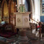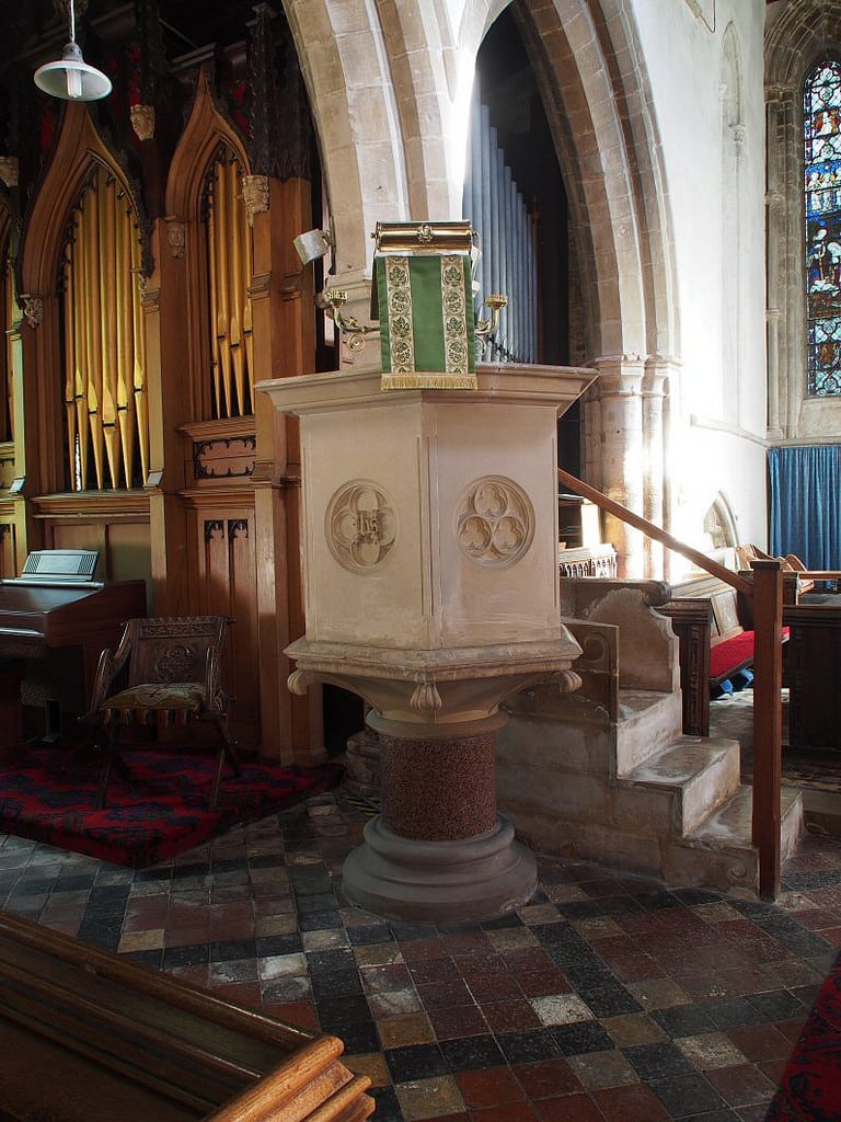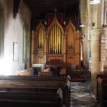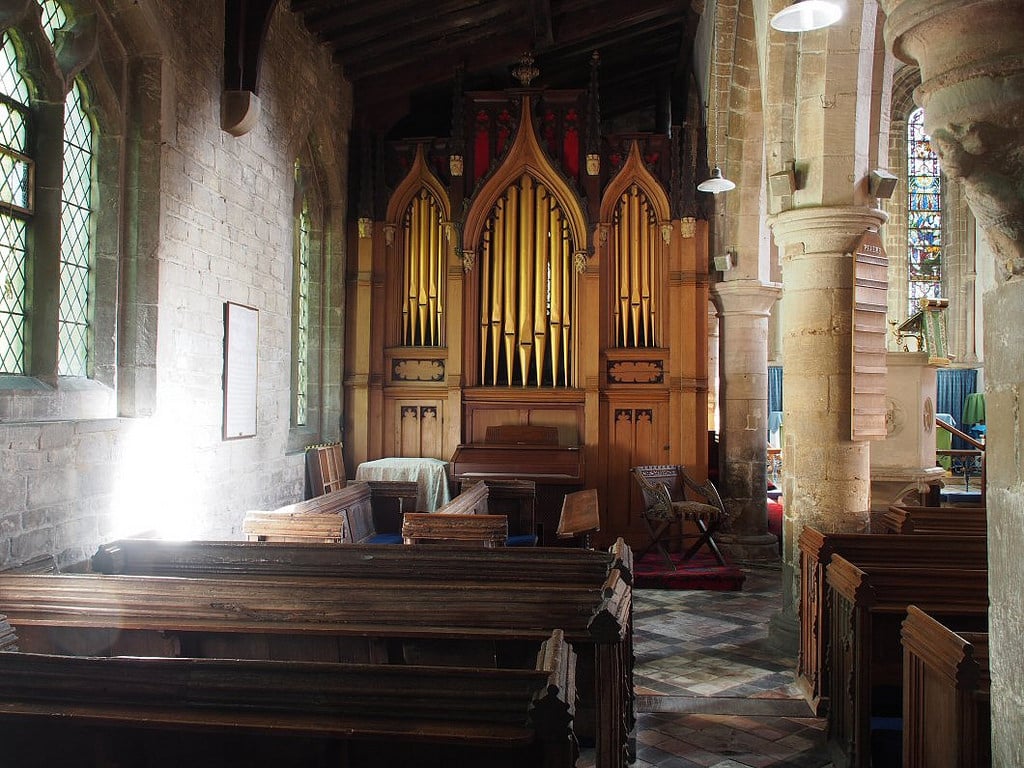 Great Organ: Open Diapason no.1 8′, Open Diapason no.2 8′, Stopped Diapason 8′, Dulciana 8′, Clarabella 8′, Flauto Traverso 8′, Principal 4′, Waldflute 4′, Twelfth 2 2/3′, Fifteenth 2′.