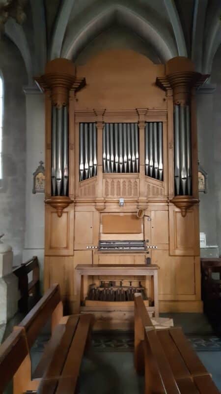 GRAND ORGUE (C-f3): 54 TOETSEN Montre 8′, Bourdon 8′, Prestant 4′, Trompette 8′.