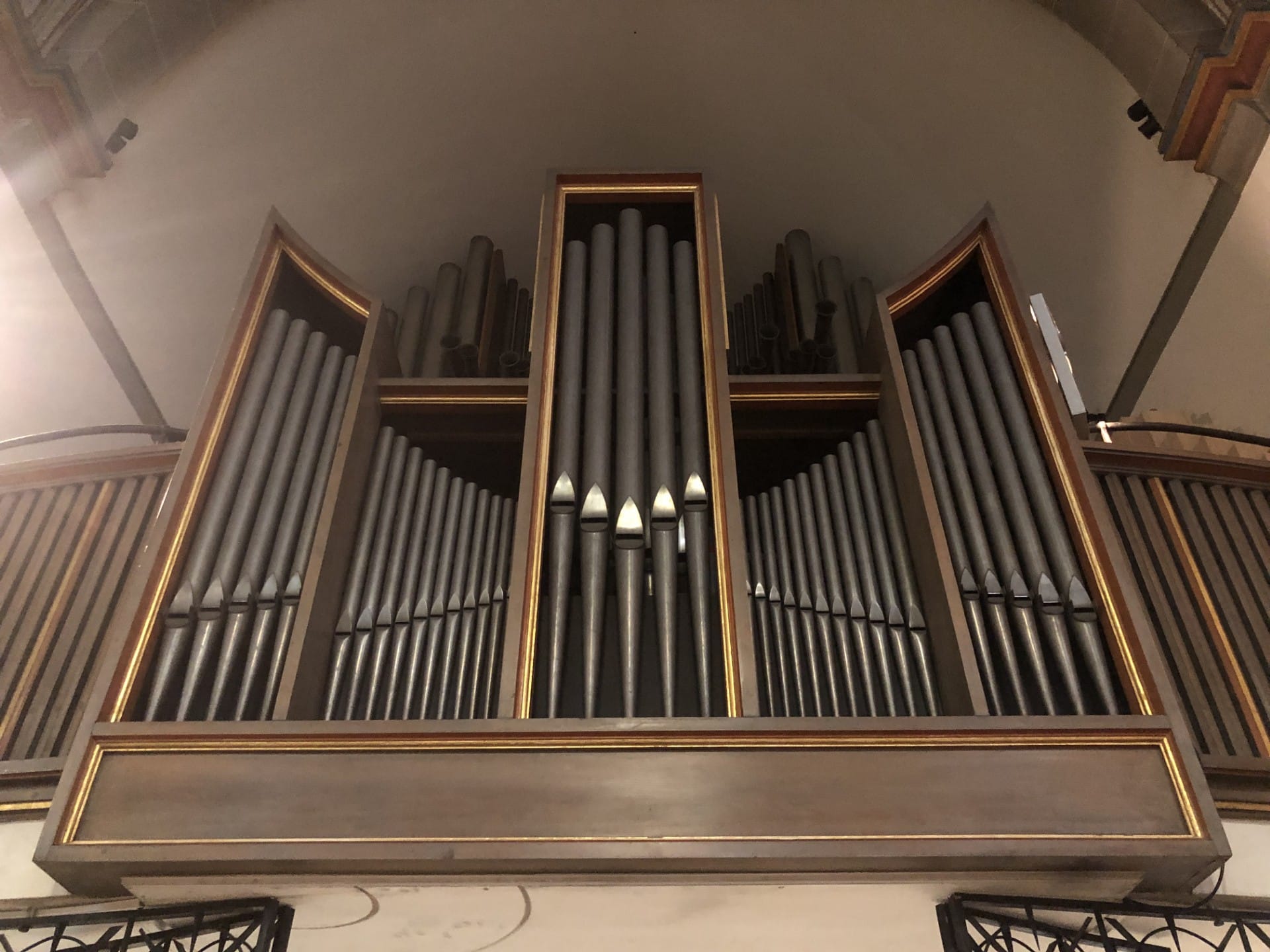 HAUPTWERK: C – g3 (56 TOETSEN) Principal 8′, Gemshorn 8′, Gamba 8′, Octave 4′, Rohrflöte 4′, Octave 2′, Rauschquinte 2 fach, Mixtur 4-5 fach, Zimbel 3 fach, Trompete 16′, Trompete 8′.