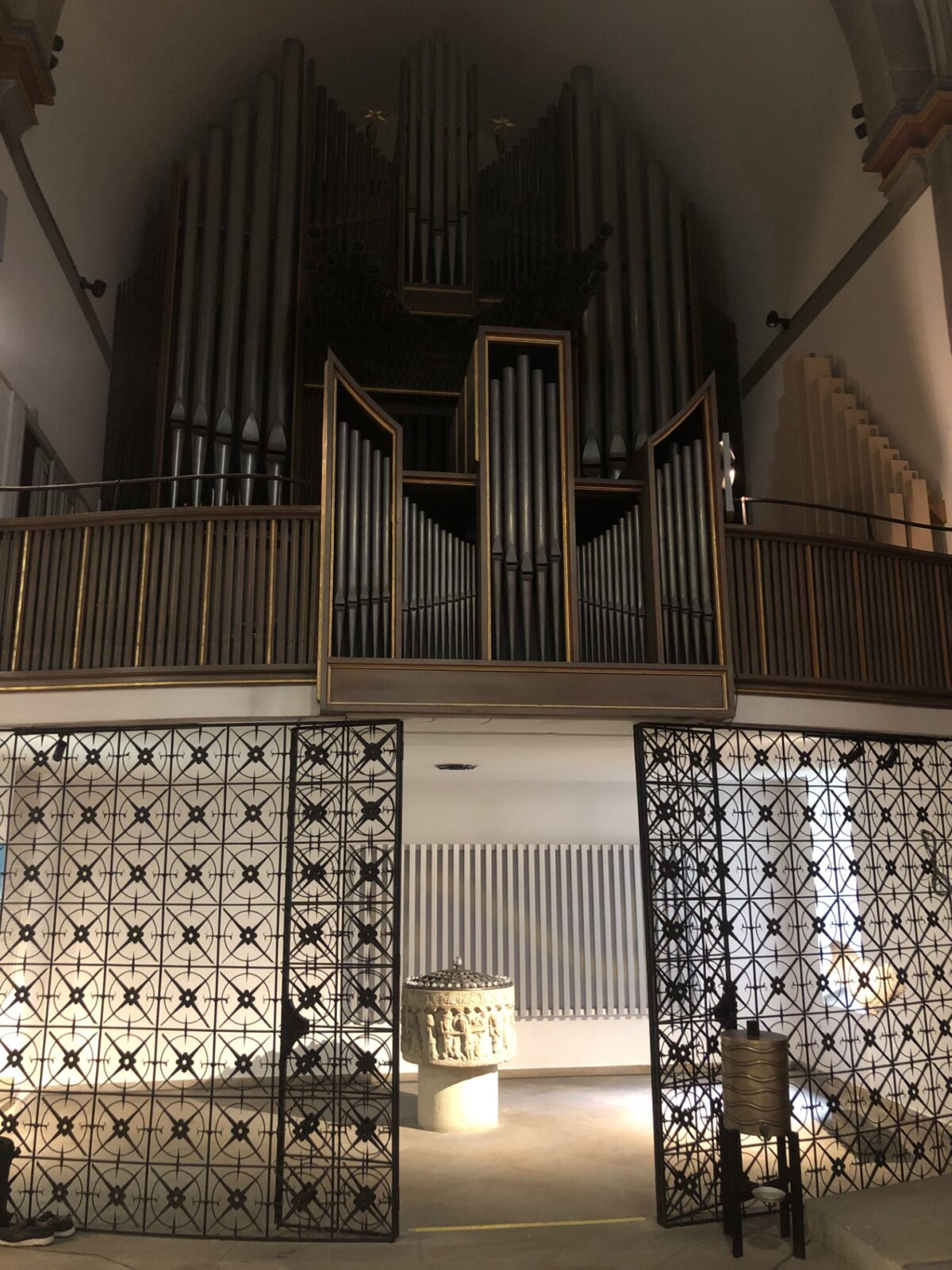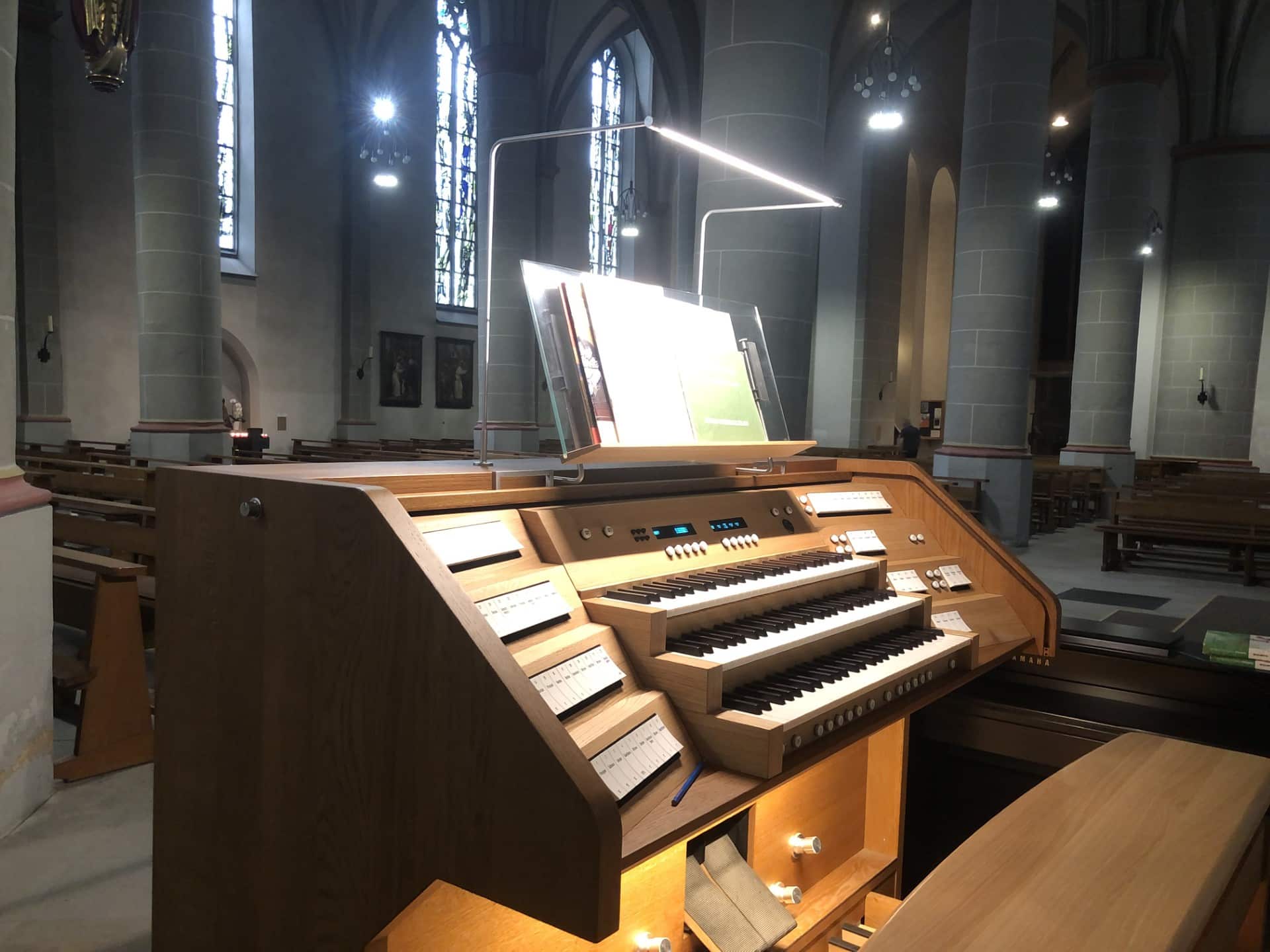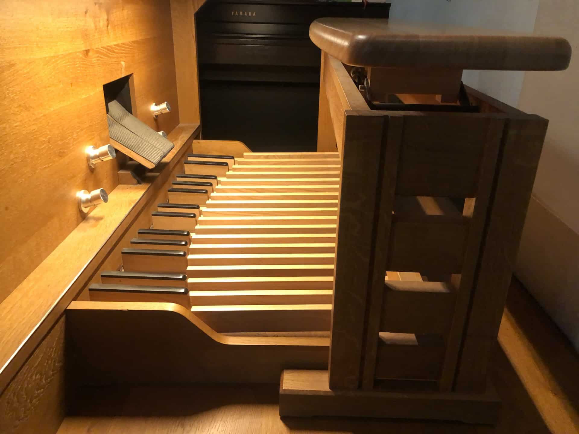 SCHWELLWERK: C – g3 (56 TOETSEN) Holzprincipal 8′, Flûte Traversière 8′, Violflöte 8′, Aeoline 8′, Vox Coelestis 8′, Prestant 4′, Blockflöte 4′, Nasat 2 2/3′, Doublette 2′, Tierce 1 3/5′, Larigot 1 1/3′, Septime 1 1/7′, Octave 1′, Fourniture 5 fach, Zimbel 3 fach, Basson 16′, Trompette 8′, Hautbois 8′, Schalmey 8′, Clairon 4′, Tremulant.