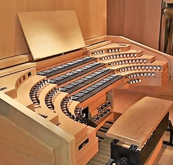 RÉCIT (C – c4) 61 TOETSEN: Salicional 16′, Bourdon 16′, Diapason 8′, Flute Traversiere 8′, Konzertflöte 8′, Aeoline 8′, Vox Coelestis 8′ (from c°), Octave 4′, Flute Octaviante 4′, Violine 4′, Nasat 2 2/3′, Doublette 2′, Kleincornett 3 fach (from g°), Plein Jeu Harmonique 2-5 fach, Harmonia Aetheria 3 fach (2 2/3′), Basson 16′, Trompette Harmonique 8′, Hautbois 8′, Voix Humaine 8′, Clairon Harmonique 4′.