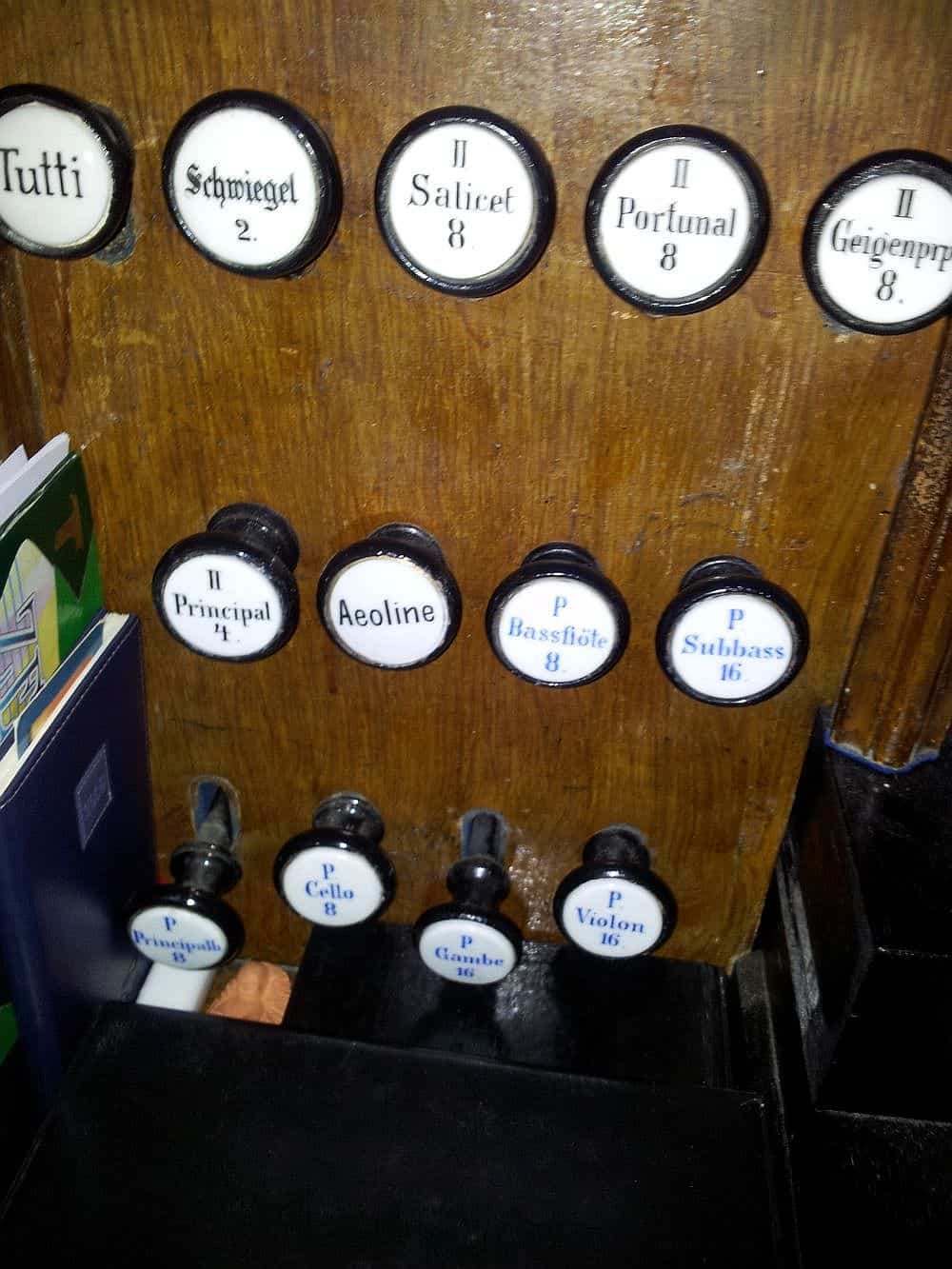 Manual II: C – f3 Geigenprincipal 8′, Portunal 8′, Salicet 8′, Aeoline 8′, Principal 4′, Schwiegel 2′.