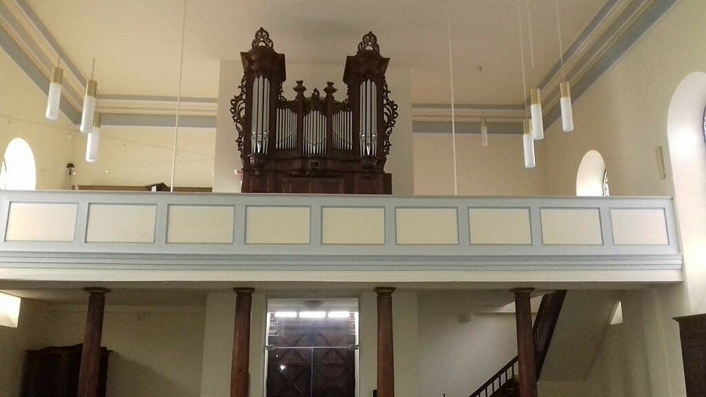 MANUAL (C-d3): 51 TOETSEN Salicional 8′ – 1858, Bourdon 8′, Montre 4′, Flûte 4′, Nazard 2 2/3′ – 1952, Flageolet 2′, Cornet 5 rangs, Fourniture 3 rangs, Cromorne 8′ (bas), Trompette 8′ (discant).