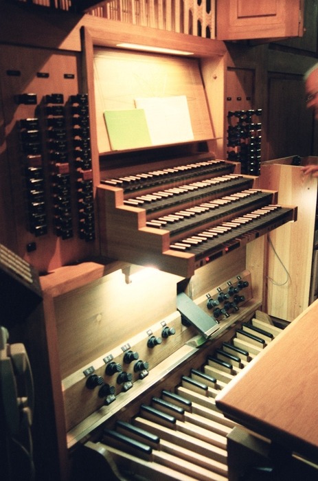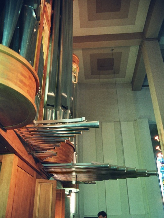 SCHWELLWERK (C – g3) 56 TOETSEN: Bourdon 16′, Geigenprinzipal 8′, Metallgedeckt 8′, Salicional 8′, Aeoline 8′, Vox Coelestis 8′ (vanaf c°), Octave 4′, Blockflöte 4′, Fugara 4′, Nasard 2 2/3′, Feldflöte 2′, Tierce 1 3/5′, Sifflöte 1′, Harmonica Aetheria 3 fach (2 2/3′), Plein Jeu 5 fach (2′), Dulcian 16′, Oboe 8′, Schalmay 4′, Tremulant.