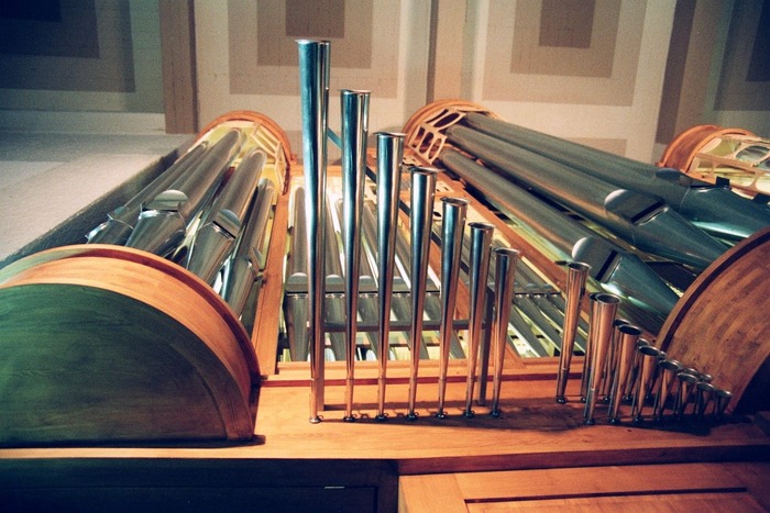 BRUSTWERK (C – g3) 56 TOETSEN: Holzgedeckt 8′, Kleingedeckt 4′, Nasat 2 2/3′ (vanaf g°), Doublette 2′, Terz 1 3/5′ (vanaf b), Cymbel 2 fach (2/3′), Vox Humana / Cromorne 8′, Tremulant.