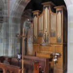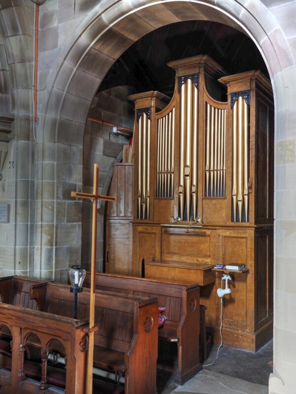 Manual: C – f3 (54 toetsen) in zwelkast Open Diapason 8′, Stopt Diapason Bass 8′ (C-e), Stopt Diapason Treble 8′, Viola da Gamba 8′, Principal 4′, Flute 4′, Twelfth 2 2/3′, Fifteenth 2′.