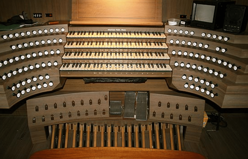 SWELL (IN ZWELKAST) (C – c4) 61 TOETSEN: Bourdon 16′, Geigenprincipal 8′, Flute Harmonique 8′, Metallgedackt 8′, Spitzgamba 8′, Unda Maris 8′, Fugara 4′, Flute Octaviante 4′, Octavin 2′, Plein Jeu 6 fach, Basson 16′, Trompette Harmonique 8′, Hautbois 8′, Clairon Harmonique 4′, Tremulant, Cymbelstern, Nachtigall.