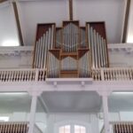 BRUSTWERK (IN ZWELKAST) (C-a3): 58 TOETSEN Rohrgedackt 8′, Waldflöte 4′, Singend Gedackt 4′, Nasat 2 2/3′, Prinzipal 2′, Sifflöte 1′, Aliquot 1-3 fach (1 3/5′), Zimbel 3 fach (1/4′), Dulzianregal 16′, Doppelkegelregal 8′, Tremulant.