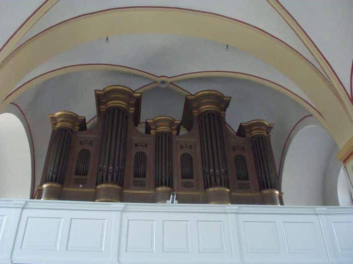 | Hauptwerk: Bordun 16 Principal 8 Viola da Gamba 8 Gedackt 8 Octav 4 Superoctav 2 Mixtur 4 fach (2′) Trompete 8 |