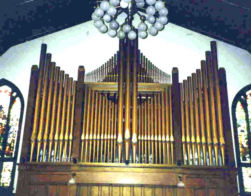 Swell Organ: Salicional 8′, Salicional Celeste 8′, Gedackt 8′, Flute 4′, Principal 2′, Nasard 2 2/3′, Scharf 4 ranks (2/3′), Trumpet 8′.