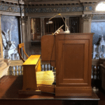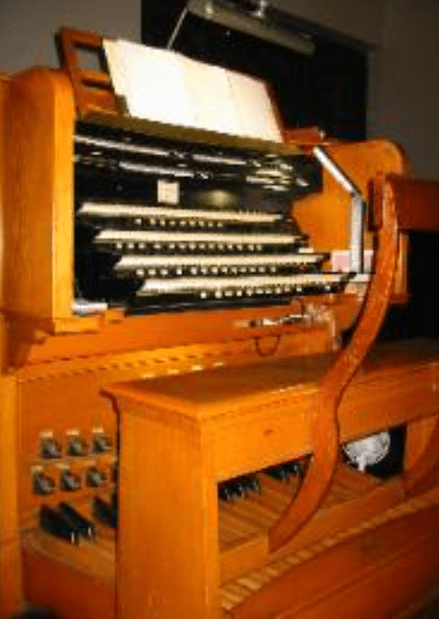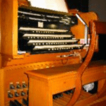 SWELL (C – c4) 61 TOETSEN: Bourdon 16′, Open Diapason 8′, Salicional 8′, Viol d’Amour 8′, Aeoline 8′, Vox Celeste 8′, Stopped Diapason 8′, Quintadena 8′, Octave 4′, Flauto Traverso 4′, Flautino 2′, Dolce Cornet 3-5 ranks, Contra Fagotto 16′, Cornopean 8′, Oboe 8′, Vox Humana 8′, Clarion 4′, Tremolo, Vox Humana Tremolo.