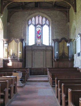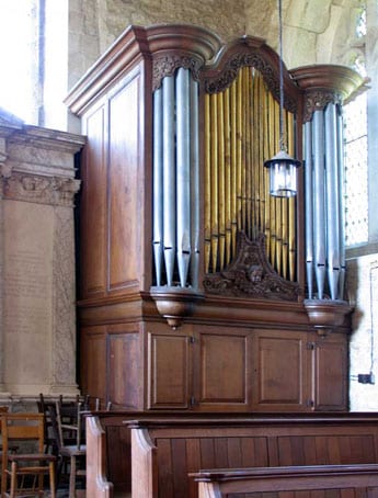 GREAT (C – g3) 56 TOETSEN: Open Diapason 8′, Stopped Diapason 8′, Dulciana 8′ (TC), Principal 4′, Wald Flute 4′, Twelfth 2 2/3′, Fifteenth 2′, Clarionet 8′ (TC).
