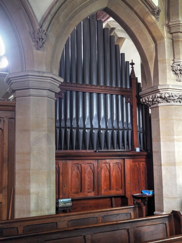 SWELL: C – g3 (56 TOETSEN) IN ZWELKAST Open Diapason 8′, Lieblich Gedact 8′, Viol d’Amour 8′, Geigen Principal 4′, Fifteenth 2′, Hautboy 8′.