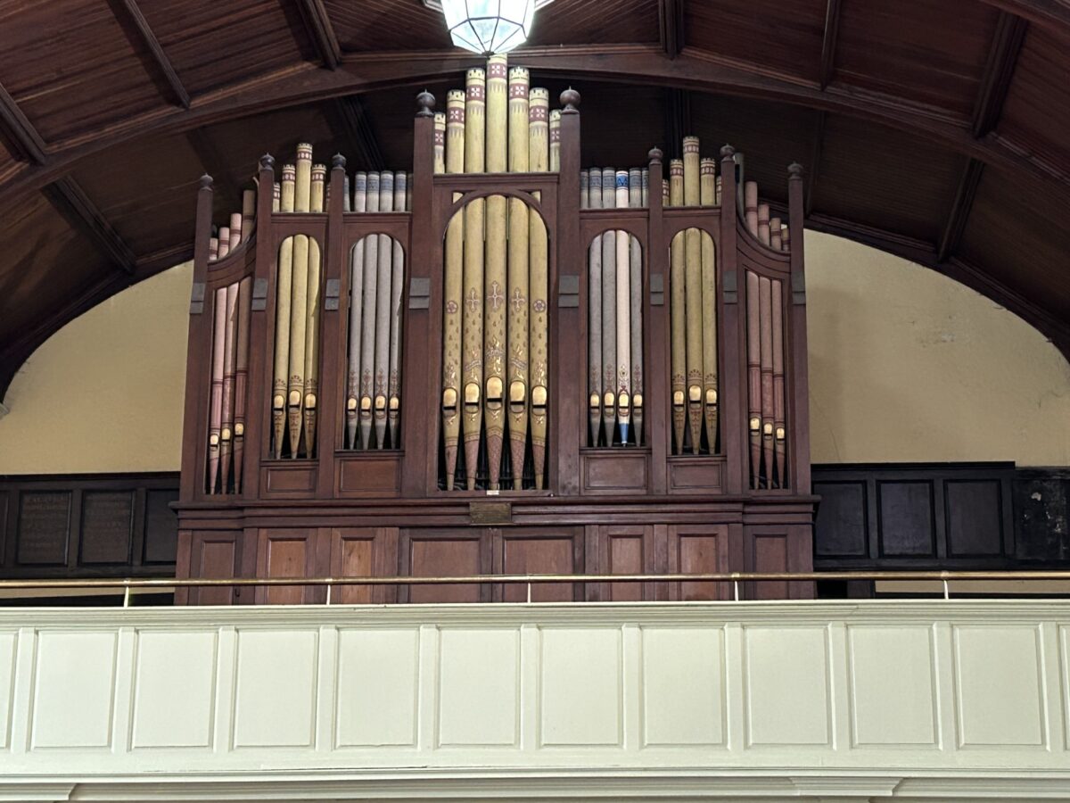 GREAT (C – g3) 56 TOETSEN: Double Open Diapason 16′, Open Diapason 8′, Gamba 8′, Lieblich Gedackt 8′, Dulciana 8′, Principal 4′, Flautina 2′, Trumpet 8′.
