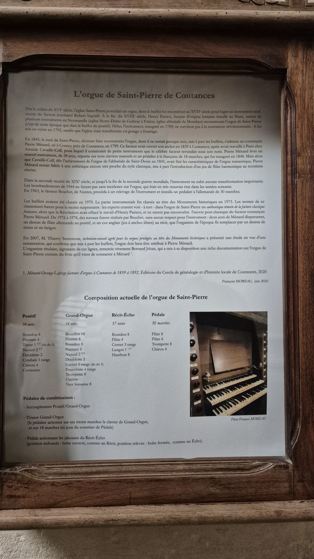 Robert Ingout bouwde in 1656 een nieuw mechanisch sleepladen-orgel voor de Église Saint-Pierre in Coutances (Manche (50)) Frankrijk. In 1769 is het instrument gerestaureerd door Henry Parizot. Pierre Ménard reconstrueerde het in 1845. Henri Didier voerde in 1933 diverse werkzaamheden uit. Manufacture Beuchet-Debièrre restaureerde het orgel in 1976.