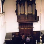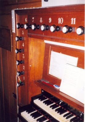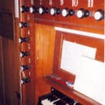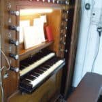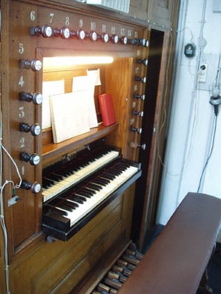 Klaviatuur bereikbaar via luik in de orgelvloer, daarna luik sluiten en orgelbank op z’n plaats op het luik(!)
