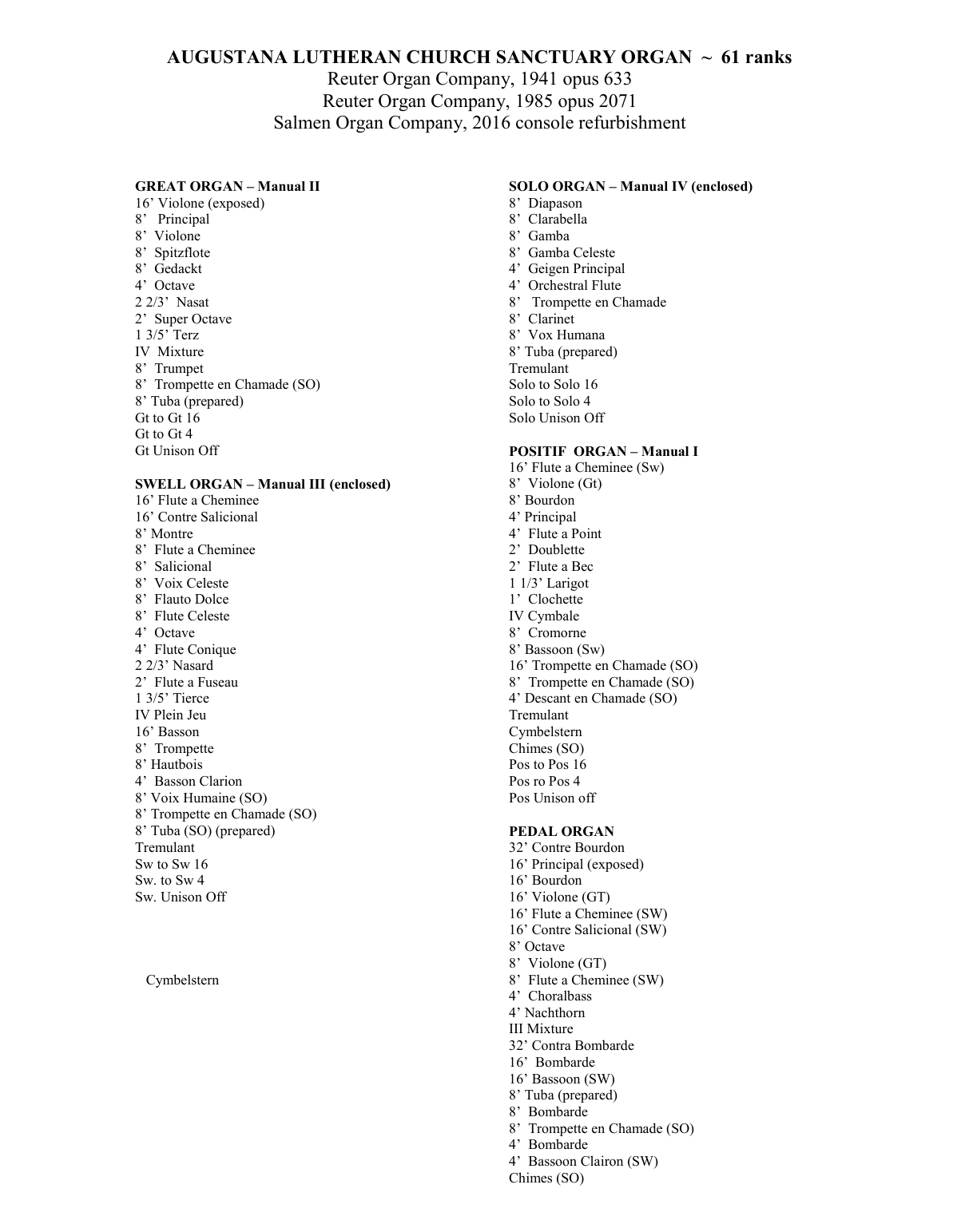 Reuter Organ Company bouwde in 1941 opus 633. Een nieuw orgel voor de Augustana Lutheran Church in Denver (Colorado) USA. In 1985 bouwde dezelfde orgelmaker het instrument om (opus 2071). In 2016 reviseerde Salmen Organ Company de speeltafel. Het pedaalklavier is radiaal concaaf.
