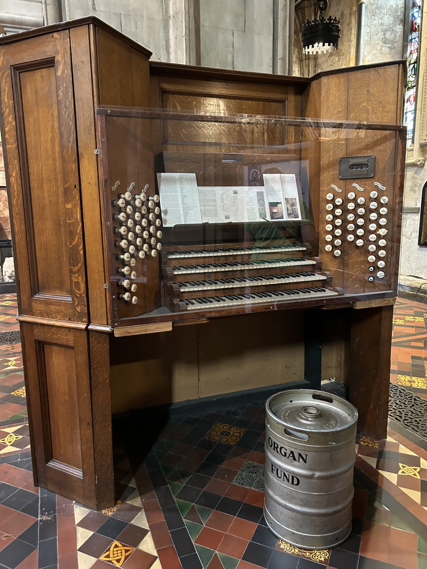SOLO (C – c4) 61 TOETSEN: Gamba 8′, Flute 8′, Concert Flute 4′, Sesquialtera 2 ranks 2 2/3′, Clarinet 8′, Orchestral Oboe 8′, Cornopean 8′, Tremulant, Double Tuba 16′, Tuba 8′, Octave Tuba 4′.