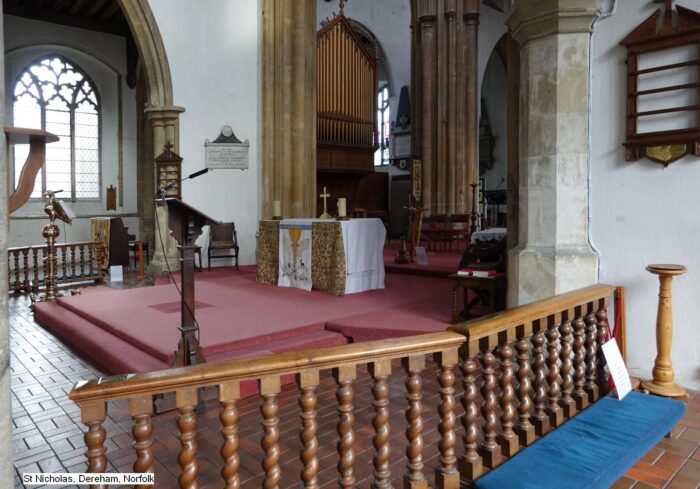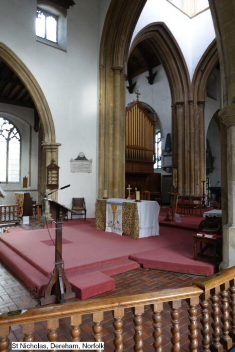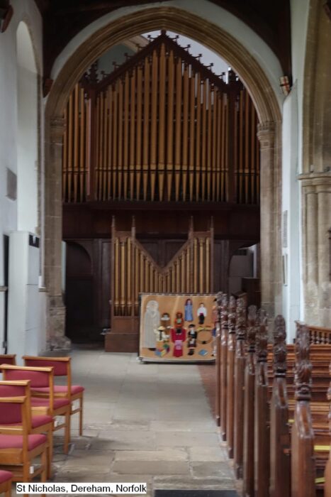 Father Smith bouwde in een onbekend jaar een nieuw huisorgel met mechanische tractuur en sleepladen voor Hon. Roger North in Rougham (Norfolk). In 1785 plaatste James Holmes dit instrument over naar de Church of Saint Nicholas in East Dereham (Norfolk). Joseph Hart breidde het orgel in 1827 uit en plaatste het in een nieuwe grotere orgelkas op de galerij aan de westzijde van de kerk. In 1874 is het omgebouwd door William Hill & Son. Hierbij werd het op de kerkvloer geplaatst. In 1964 is het orgel door Hill, Norman & Beard gerestaureerd. Richard Bower bouwde het instrument in 1995 geheel om. Tegenwoordig is de tractuur van het pedaal elektrisch. Het pedaalklavier is radiaal concaaf.