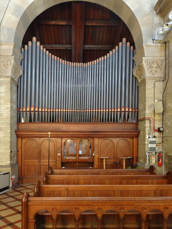 Great: C – c4 (61 toetsen) Double Open Diapason 16′, Open Diapason 8′, Viola 8′, Dulciana 8′, Claribel 8′, Double Flute 8′, Principal 4′, Harmonic Flute 4′, Fifteenth 2′, Trumpet 8′.