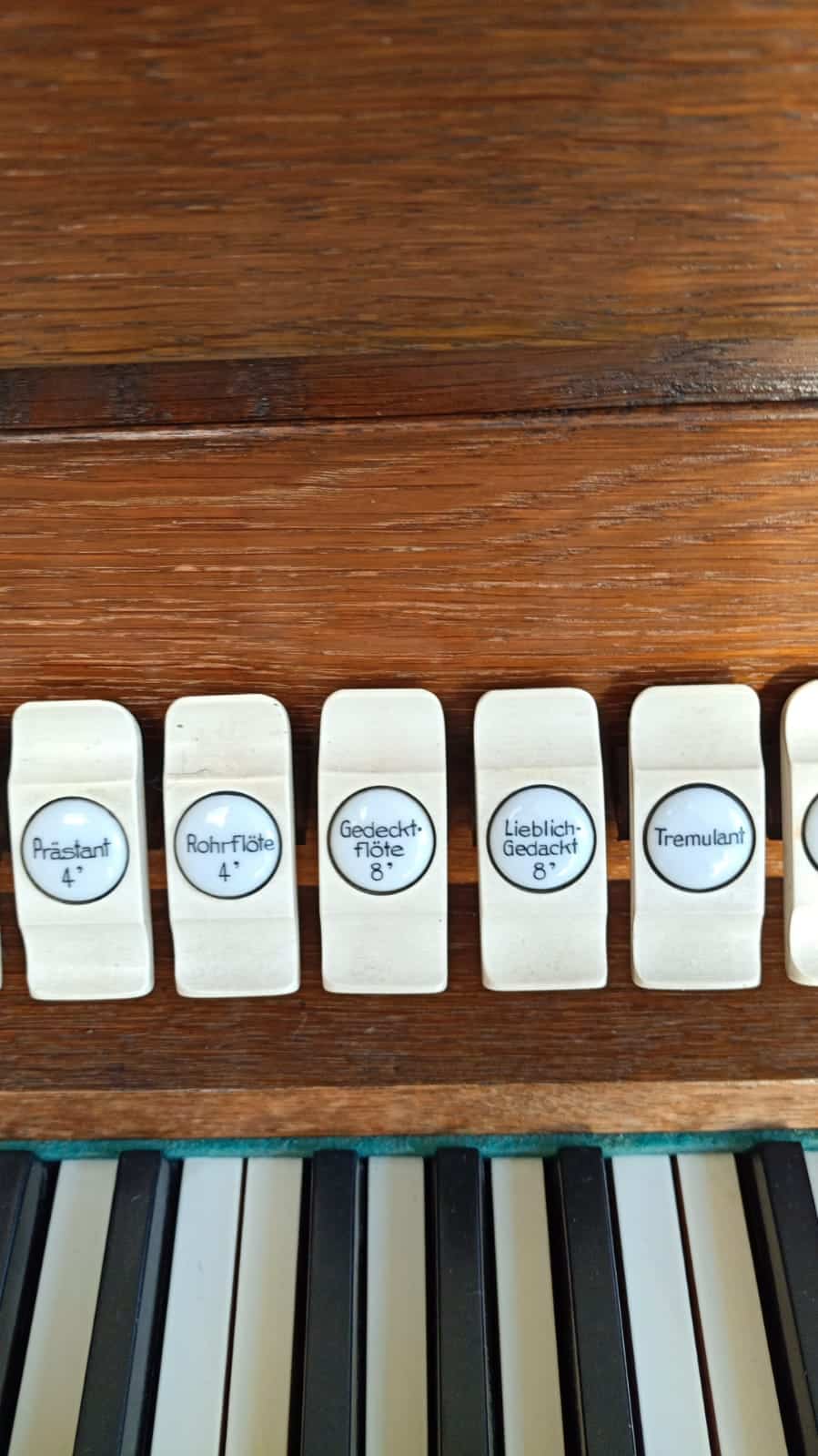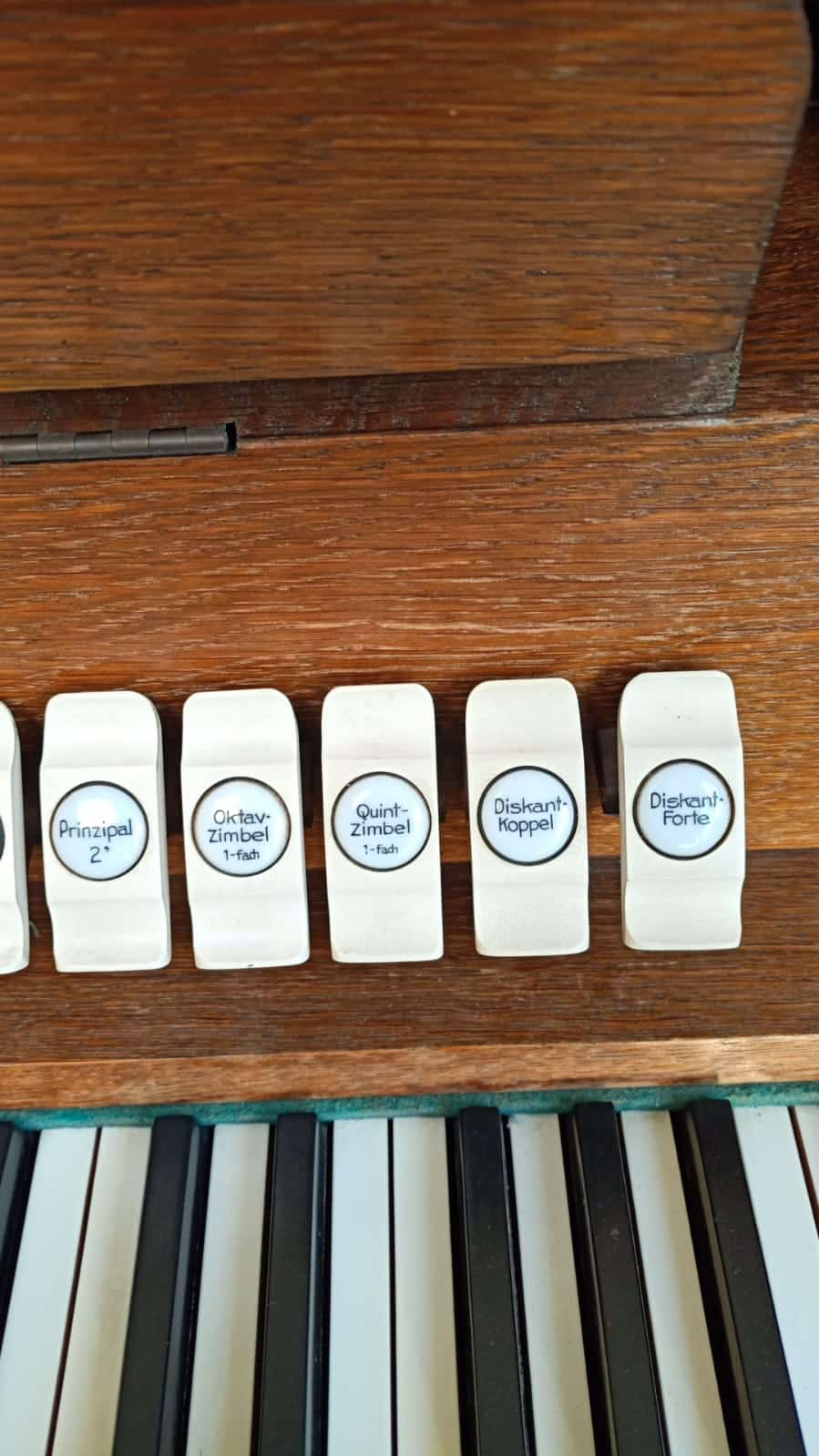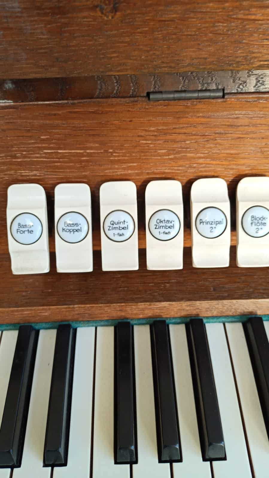 MANUAAL: FF – f3 (61 TOETSEN) Bass Forte, Bass Koppel, Quint-Zimbel 1 fach B, Oktav Zimbel 1 fach B, Prinzipal 2′ B, Block Flöte 2′ B, Prästant 4′ B, Rohrflöte 4′ B. Gedeckt-Flöte 8′ B, Lieblich Gedackt 8′ B, Tremulant, Lieblich Gedackt 8′ D, Gedeckt-Flöte 8′ D, Rohrflöte 4′ D, Prästant 4′ D, Blockflöte 2′ D, Prinzipal 2′ D, Oktav -Zimbel 1 fach D, Quint-Zimbel 1 fach D, Diskant Koppel, Diskant Forte.