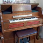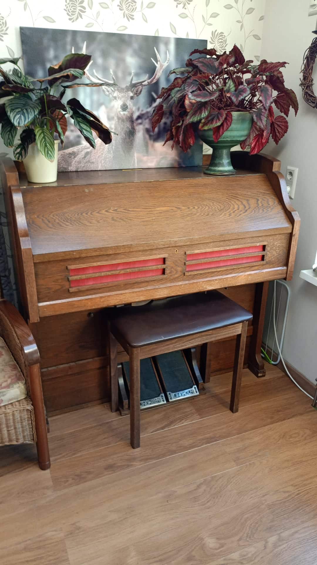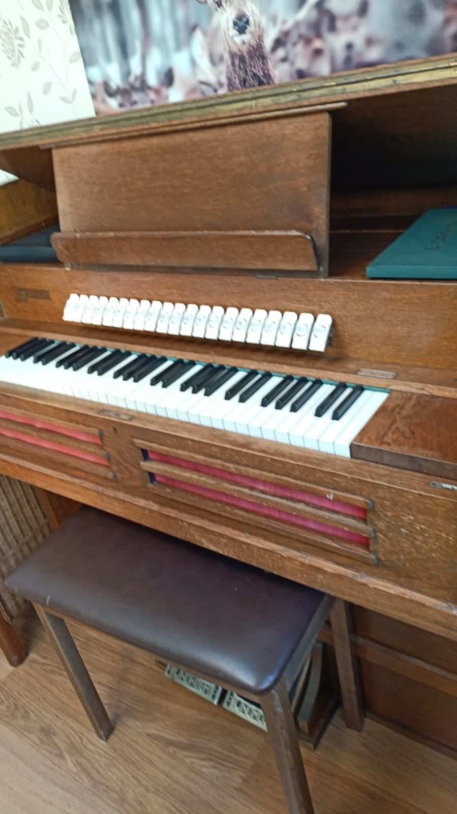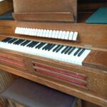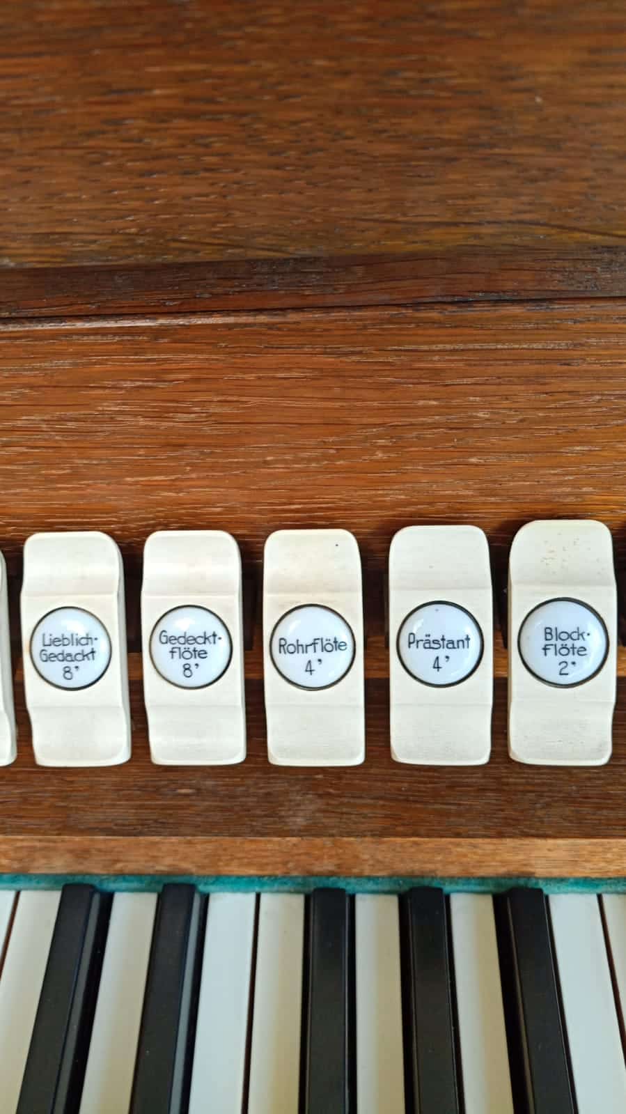 MANUAAL: FF – f3 (61 TOETSEN) Bass Forte, Bass Koppel, Quint-Zimbel 1 fach B, Oktav Zimbel 1 fach B, Prinzipal 2′ B, Block Flöte 2′ B, Prästant 4′ B, Rohrflöte 4′ B. Gedeckt-Flöte 8′ B, Lieblich Gedackt 8′ B, Tremulant, Lieblich Gedackt 8′ D, Gedeckt-Flöte 8′ D, Rohrflöte 4′ D, Prästant 4′ D, Blockflöte 2′ D, Prinzipal 2′ D, Oktav -Zimbel 1 fach D, Quint-Zimbel 1 fach D, Diskant Koppel, Diskant Forte.