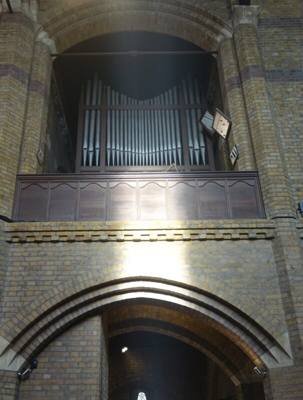 SWELL (C – f3) 54 TOETSEN (IN ZWELKAST): Double Open Diapason 16′, Open Diapason 8′, Stopped Diapason 8′, Concert Flute 8′, Gamba 8′, Principal 4′, Twelfth 2 2/3′, Fifteenth 2′, Mixture III, Cornopean 8′, Oboe 8′, Tremulant.