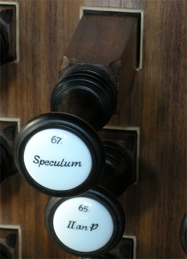 III. Schwellwerck: (C-g3) Borduen 16 Principal 8 Flöth von Holtz 8 Solicional 8 Coppel 8 Unda Maris 8 Flauth travers 4 Salicet 4 Hohlflöth 4 Quinte 3 Flageolet 2 Mixtur 1 1/3′ Fagott 16 Posaun 8 Hautbois 8 Vox humana 8 Beben |