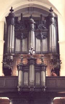 Grand-Orgue: C-f3 Bourdon 16′, Montre 8′, Viole d’Amour 8′, Bourdon 8′, Flûte Harmonique 8′, Prestant 4′, Flûte Douce 4′, Quinte 2 2/3′, Doublette 2′, Progression Harmonique 2 à 5 rangs, Cornet 5 rangs, Cymbale 2 rangs, Bombarde 16′, Trompette 8′, Clairon 4′.