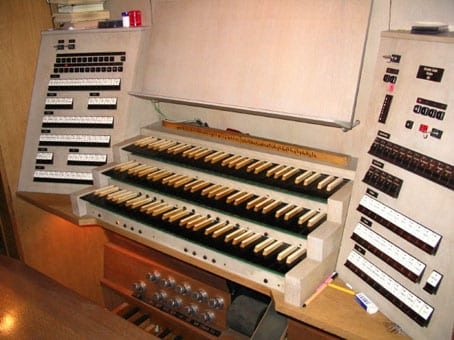 SCHWELLWERK (C – a3) 58 TOETSEN: Bordun 16′ – Klais, Geigenprincipal 8′, Flauto Traverso 8′, Salicional 8′, Schwebung 8′ (from c°), Holzgedackt 8′, Oktave 4′, Blockflöte 4′, Viola da Gamba 4′, Nassat 2 2/3′, Piccolo 2′, Terz 1 3/5′, Septime 1 1/7′, Mixtur 3-6 fach, Bombarde 16′, Hautbois 8′, Trompette Harmonique 8′, Tremulant.