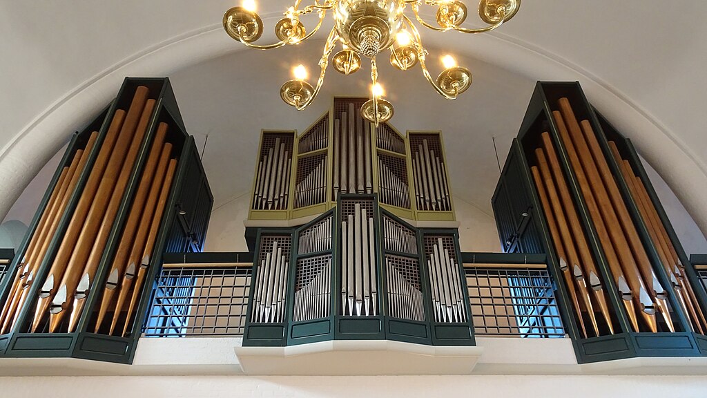 BRYSTVÆRK (C – g3) 56 TOETSEN: Trægedakt 8′, Principal 4′, Blokfløjte 4′, Nasat 2 2/3′, Waldfløjte 2′, Terts 1 3/5′, Sivfløjte 1 1/3′, Octav 1′, Cymbel 2 fag (1/6′), Regal 8′.