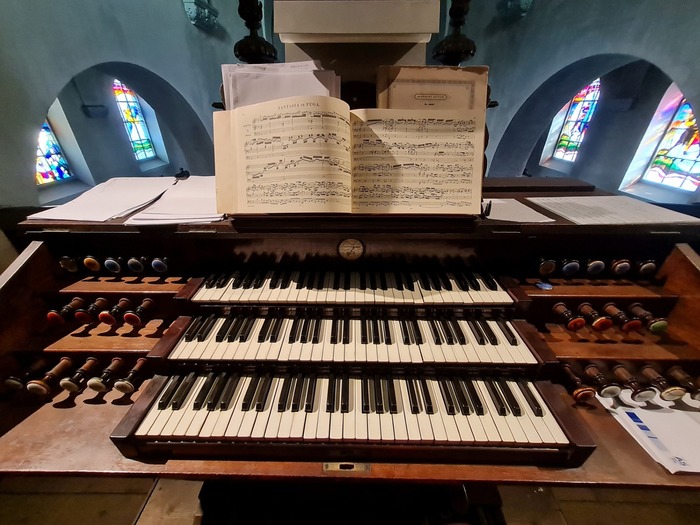 RÉCIT (C – g3) 56 TOETSEN: Principal 8′, Cor de Chamois 8′, Dulciane 8′, Voix Céleste 8′, Flûte Harmonique 4′, Piccolo 1′, Basson-Hautbois 8′, Voix Humaine 8′, Trémolo.