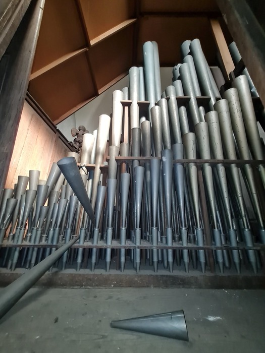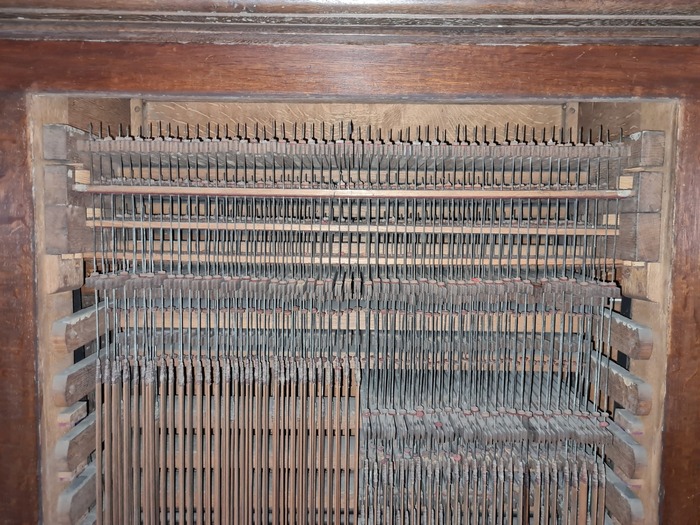 GRAND ORGUE (C – g3) 56 TOETSEN: Bourdon 16′, Montre 8′, Viole de Gambe 8′, Bourdon 8′, Flûte 8′, Prestant 4′, Fourniture 3 rangs, Bombarde 16′, Trompette 8′, Clairon 4′.