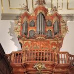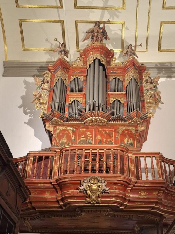In 1715-1716, Johann Heinrich Ulenkampf built a new mechanical slider chest organ for the cathedral of Faro (Faro), Portugal. However, the instrument was built in Arp Schnitger’s workshop and only installed in Faro by Ulenkampf, an employee of Schnitger. It was originally located near the chancel arch, but after an earthquake in 1722, it was moved to the west side of the church. After another earthquake in 1767, it was restored by Pasquale Gaetano Oldovini and installed in a new gallery on the northwest side of the church. During the restoration, much of the pipework was replaced, including the front pipes. In 1974, the Flentrop company from Zaandam restored the instrument.