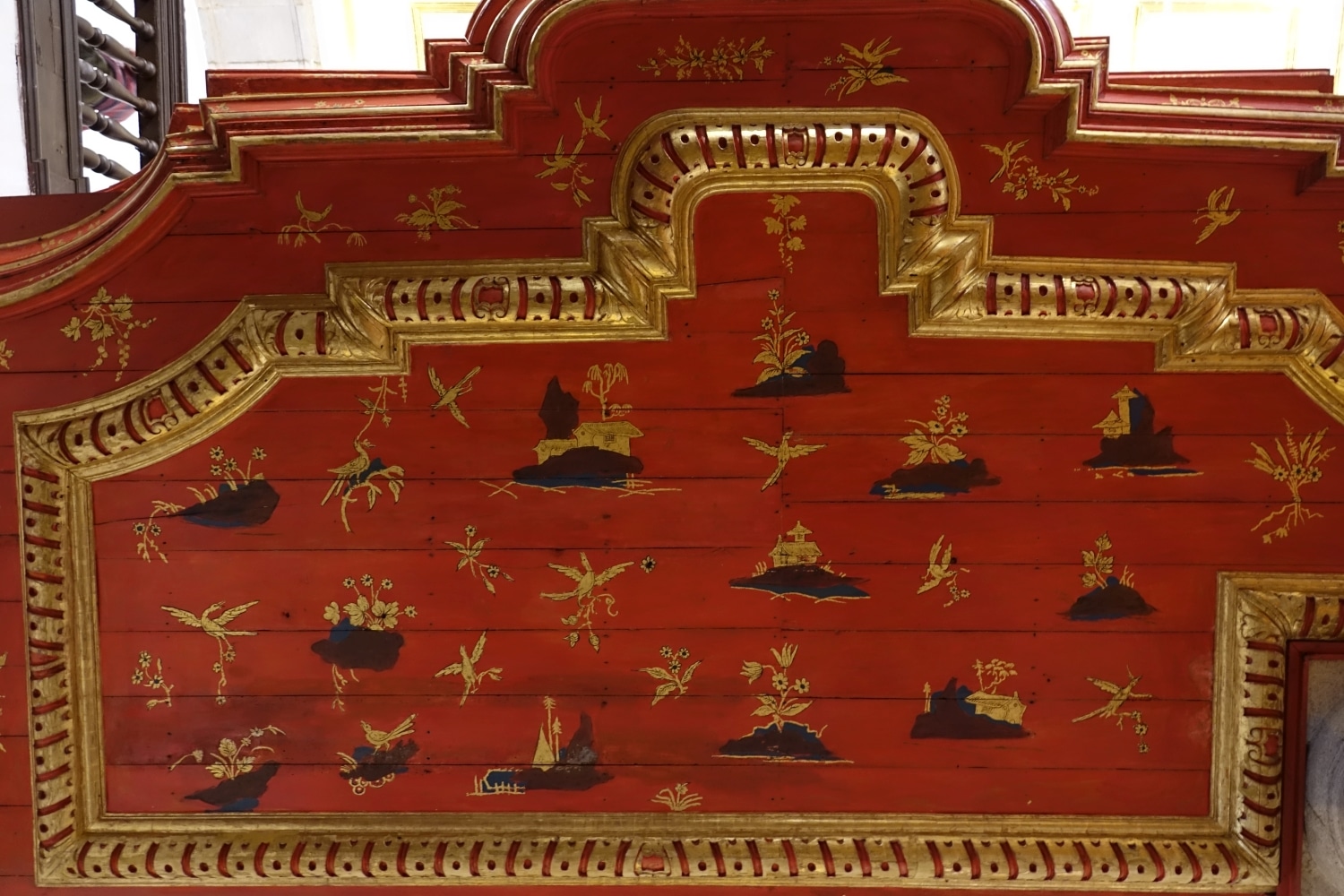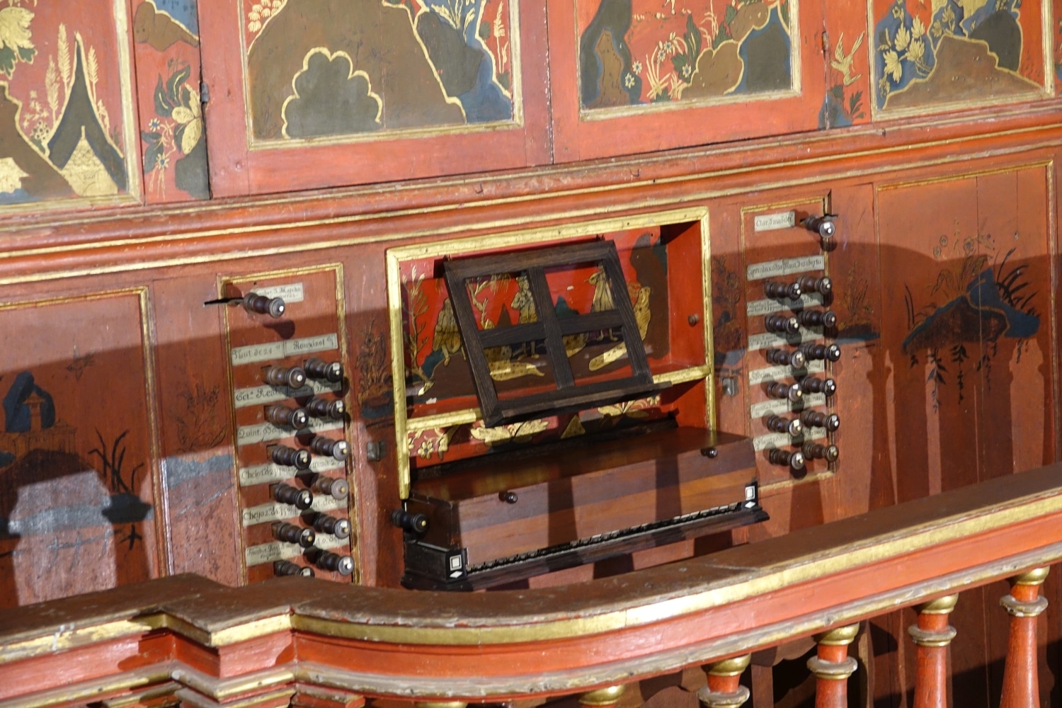 BRUSTWERK (CDEFGABH-c3) 42 TOETSEN (KORT OCTAAF): Flautado 8′, Flauto o. Seis 4′, Flautilha de Mão Direit 4′ (discant), Quintadecima 2′, Decima Nona 1 1/3′, Vigesima 1′, Cornettilha d Eccos II (bas), Cheio d Mão Direit II (discant), Cheio d Mão Esq. III (bas), Cornettilha d Eccos III (discant).